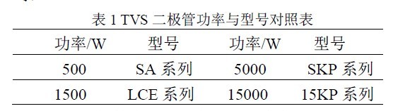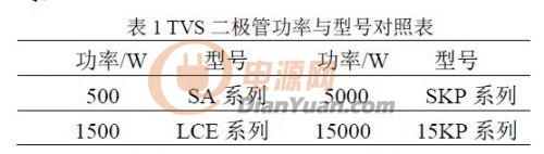 另一种浪涌抑制元件是瞬态电压抑制器(TVS)。当TVS 两极受到反向瞬态高能量冲击时,它能以10-12s量级的速度,将其两极间的高阻抗变为低阻抗,迅速吸收高达数千瓦数量级的浪涌功率,使两极间的电压箝位于一个预定值,有效地保护电子线路元器件免受各种形式的浪涌脉冲的损害[2]。瞬态电压抑制器具有体积小,安装尤其方便,响应时间快、瞬态功率大、漏电流低,击穿电压偏压小,箝位电压易控制等特点。TVS 二极管有下列不同功率可选择:(ProTek 公司)