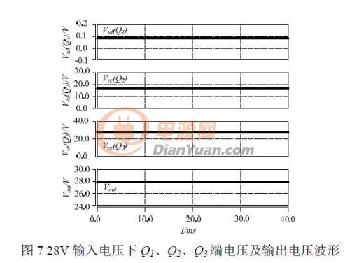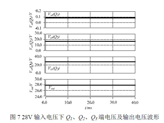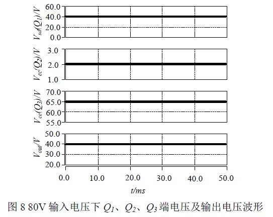 图7 和图8 为仿真波形,由仿真分析可见,当输入电压为28V 时,输出电压为27.9V;当输入电压超出36V 后,随着输入电压增大,功率管上承受的压降增加,抑制输出电压的增大,当输入电压为80V 浪涌电压时,输出电压可抑制在40V。