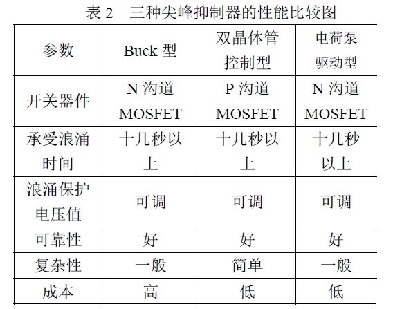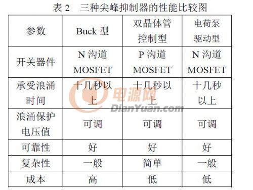 该电路优点:相比于Buck 型浪涌抑制电路,正常工作时,电流只流过一个开关管,损耗更小;缺点:电路复杂性增加。对比三种有源浪涌抑制电路性能,如表2 所示,双晶体管控制型浪涌抑制电路原理简单,器件较少,但采用P 沟道型MOS 管,在大功率场合下,开关器件通态损耗大,所以适用于小功率场合;Buck 型浪涌抑制电路和电荷泵驱动型浪涌抑制电路可用于各种功率等级,但从成本角度考虑,电荷泵驱动型浪涌抑制电路更具优势。