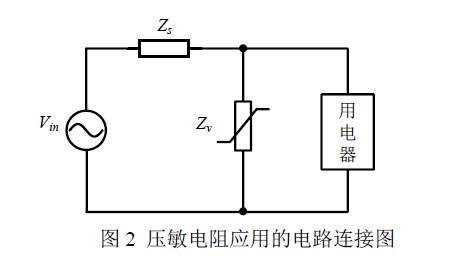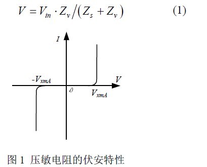 ZnO压敏电阻器是一种以ZnO 为主体、添加多种金属氧化物、经典型的电子陶瓷工艺制成的多晶半导体陶瓷元件。压敏电阻的伏安特性如图1 所示,它与两只特性一致的背靠背连接的稳压管性能基本相同。压敏电阻在电路中通常并联在被保护电器的输入端,如图2 所示。图中,Zs 的作用是限制过压时的电流,压敏电阻的Zv 与电路总阻抗构成分压器,因此压敏电阻的限制电压为
