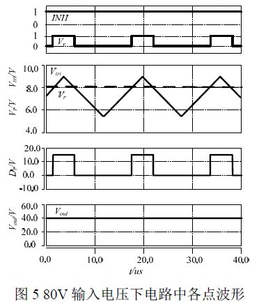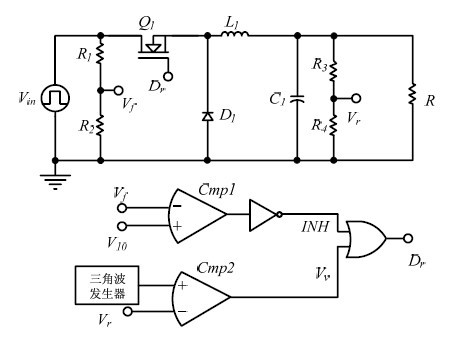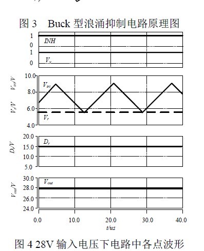 Buck 型浪涌抑制电路由Buck 主电路和控制电路组成。如图3 所示,其中R1、R2 采样输入电压得到电压Vf,R3、R4 采样输出电压得到电压Vr。具体控制原理如下:采样电压Vf 与基准电压V10,经由比较器cmp1 进行比较,输出信号INH;采样电压Vr与三角波经过比较器cmp2,输出信号Vv;信号INH与Vv 通过或门运算,输出信号Dr,用于控制主电路中功率管,达到抑制浪涌电压的目的。图4 和图5 为仿真波形,由仿真分析可见,当输入电压为28V 时,输出电压为27.9V;当输入电压超出36V 后,随着输入电压增大,占空比减小,抑制输出电压的增大,当输入电压为80V 浪涌电压时,输出电压可抑制在40V。