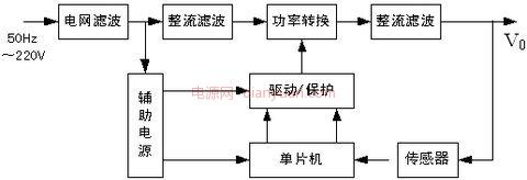 系统硬件部分由输入输出整流滤波电路、功率变换部分、驱动电路、单片机系统和辅助电路等几部分组成。图1为单片机控制功率直流电源结构框图。