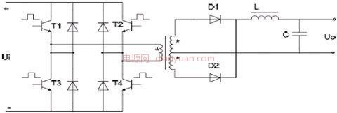 开关电源主电路是用来完成DC-AC-DC 的转换,系统主电路采用全桥型DC-DC 变换器,如图2 所示。本系统采用的功率开关器件是EUPEC 公司的BSM 50GB120DN2 系列的IGBT 模块,每个模块是一个半桥结构,故在全桥系统中,需要两个模块。每个模块内嵌入一个快速续流二极管。