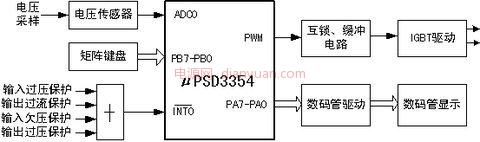 功率直流电源的控制电路采用ST 公司的μpsd3354 单片机为核心。控制电路主要完成如下功能:电压采集、A/D 转换、闭环调节、PWM 信号产生,IGBT 驱动与保护、键盘输入和输出电压显示等功能。控制电路主要包括:单片机系统、电压采集电路、IGBT驱动电路和键盘、显示电路等。结构框图如图3 所示。系统通过PWM 输出控制功率转换开关的导通与关断时间,完成对输出电压的稳定控制,通过A/ D 转换完成对开关电源输出电压的采样,同时采用电压闭环控制,开关电源工作时,根据期望值与电压反馈值的偏差,由单片机实现对PWM 占空比进行PID 调节。