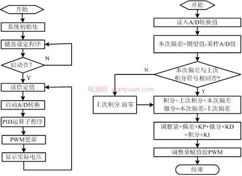 本系统主程序流程图如图4所示。主流程在完成各种变量和I/O初始化后,可以输入期望电压值并存入寄存器,当按下启动按钮后,启动电源系统,这里设定启动时,使PWM输出占空比为最小值,即0.1%。启动后,调用A/D转换子程序并读入键值,将反馈电压值与给定电压值相比较后,调用PID调节运算,更新驱动波形的占空比,然后调用PWM产生子程序输出PWM信号,并通过显示子程序显示输出电压。