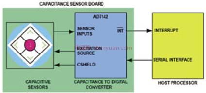 电容触摸传感器接口通常由一个电容传感器、一个电容数字转换器(CDC)和一个主处理器组成(图1)。传感器利用标准两层或四层PCB上的走线(trace)或柔性电路制造,因此不需要任何外部元件或材料。