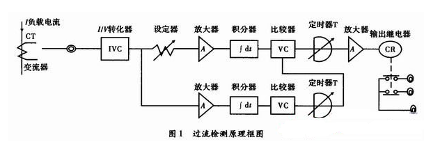 过流检测传感器的工作原理如图1所示。通过变流器所获得的变流器次级电流经I/V转换成电压,该电压直流化后,由电压比较器与设定值相比较,若直流电压大于设定值,则发出辨别信号。但是这种检测传感器一般多用于监视感应电源的负载电流,为此需采取如下措施。由于感应电源启动时,启动电流为额定值的数倍,与启动结束时的电流相比大得多,所以在单纯监视电流电瓶的情况下,感应电源启动时应得到必要的输出信号,必须用定时器设定禁止时间,使感应电源启动结束前不输出不必要的信号,定时结束后,转入预定的监视状态。