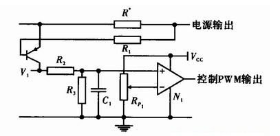 在一般情况下,利用基极驱动电路将电源的控制电路和开关晶体管隔离开。控制电路与输出电路共地,限流电路可以直接与输出电路连接,工作原理如图3所示,当输出过载或者短路时,V1导通,R3两端电压增大,并与比较器反相端的基准电压比较。控制PWM信号通断。