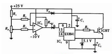 当电源输出过载或者短路时,IGBT的Vce值则变大,根据此原理可以对电路采取保护措施。对此通常使用专用的驱动器EXB841,其内部电路能够很好地完成降栅以及软关断,并具有内部延迟功能,可以消除干扰产生的误动作。其工作原理如图4所示,含有IGBT过流信息的Vce不直接发送到EXB841 的集电极电压监视脚6,而是经快速恢复二极管VD1,通过比较器IC1输出接到EXB841的脚6,从而消除正向压降随电流不同而异的情况,采用阈值比较器,提高电流检测的准确性。假如发生了过流,驱动器:EXB841的低速切断电路会缓慢关断IGBT,从而避免集电极电流尖峰脉冲损坏IGBT器件。