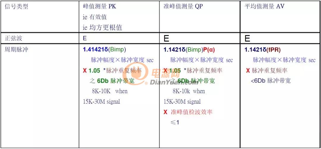 EMI Receiver可以进行准峰值测量、峰值测量和平均值测量。当输入信号是正弦波时,无论用何种方式测量,得到的读数都是相同的,等于该正弦波的有效值,精度应优于±2dB。但是如果输入的是周期脉冲信号,则三种测量方法得到的读数是不一样的,其结果如表所示。