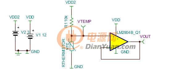 图7:使用NTC热敏电阻和运算放大器进行温度感测