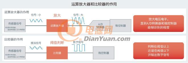 运算放大器(Operational amplifier)简称“运放”,可放大输入信号。通过放大传感器输出信号等微小信号,使之达到微控制器等可识别的电压电平。