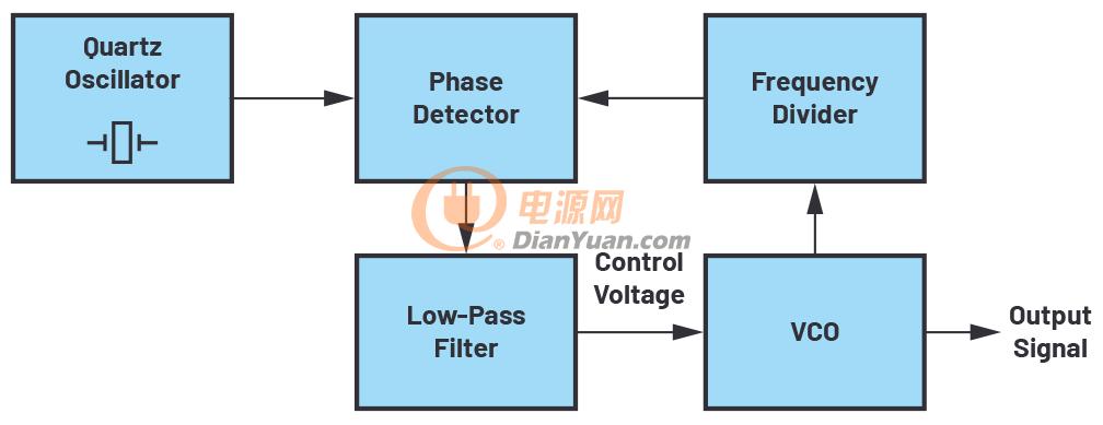 图1所示为基于PLL的频率合成器框图。VCO生成输出信号。通过PLL将其保持在设定频率,并锁定到基准频率。基准频率通常由非常精准的石英振荡器提供。在锁相环电路的反馈路径部分,在鉴相器前通过分频器提供可调的VCO分频比。