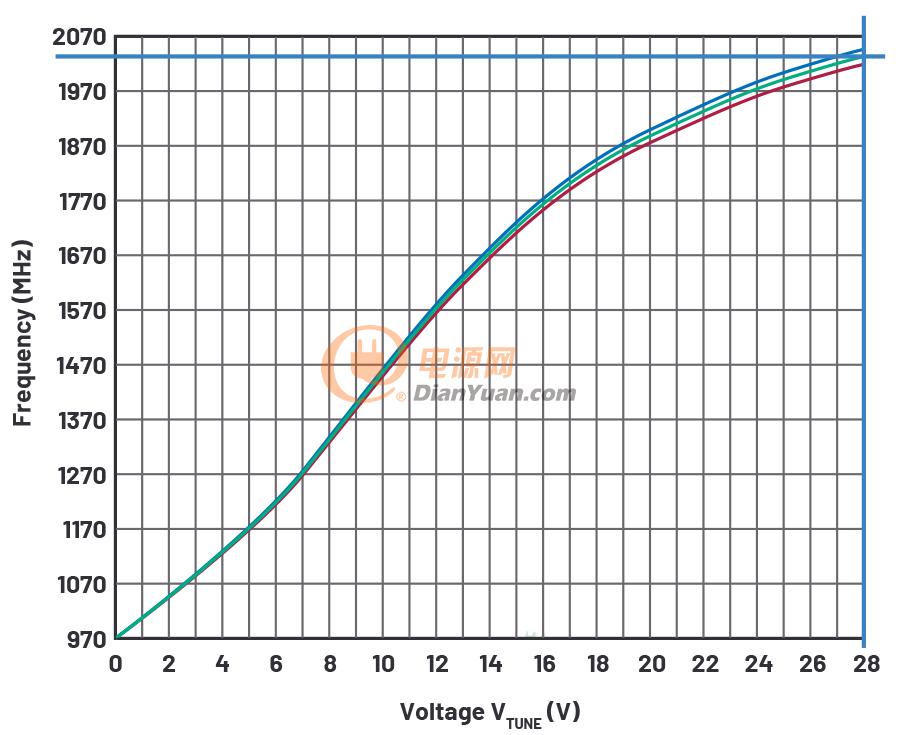 VCO可以使用Synergy Microwave Corporation的DCYS100200-12。该产品在28 V (VTUNE)时产生2 GHz频率,如图3所示。