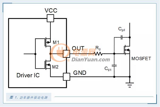 功率器件如MOSFET、IGBT需要驱动电路的配合从而得以正常地工作。图1显示了一个驱动芯片驱动一个功率MOSFET的电路。当M1开通,M2关掉的时候,电源VCC通过M1和Rg给Cgs,Cgd充电,从而使MOSFET开通,其充电简化电路见图2。当M1关断,M2开通的时候,Cgs通过Rg和M2放电,从而使MOSFET关断,其放电简化电路见图3。