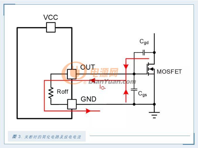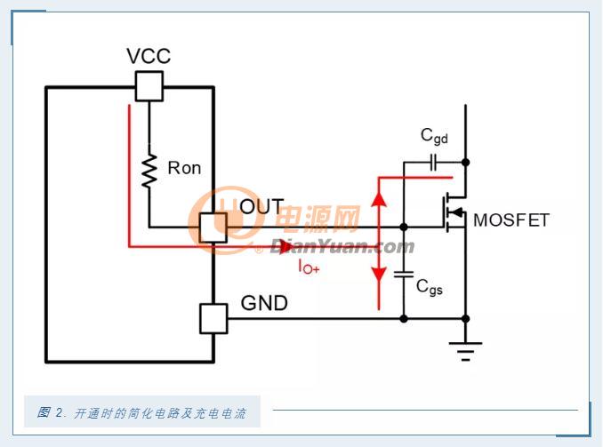 图4显示了一个MOSFET开通时门极驱动电压和驱动电流的简化时序图。t1到t2这段时间是门极驱动的源电流(IO+)从零开始到峰值电流的建立时间。在t3时刻,门极电压达到米勒平台,源电流开始给MOSFET的米勒电容充电。在t4时刻,米勒电容充电完成,源电流继续给MOSFET的输入电容充电,门极电压上升直到达到门极驱动的电源电压VCC。同时在t4到t5这个期间,源电流也从峰值电流降到零。