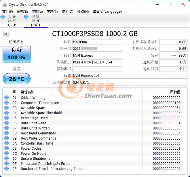 Crystal Disk Info:首次上电,可见这块英睿达 P3 Plus 1TB 的固件版本号为 P9CR40A 。