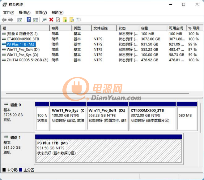 在 Windows 11 磁盘管理中完成初始化后,显示英睿达 P3 Plus 1TB 的可用容量为 931.50 GB 。