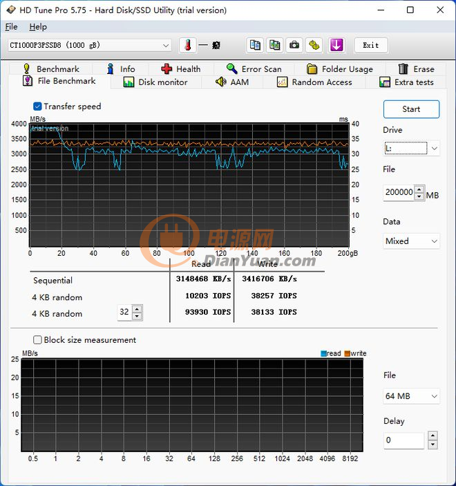 HD Tune Pro -- 200GB 混合模式【中文版闪崩,这里用英文试用版代替】,顺序读写可超 3100+ 和 3400 MB/s 。