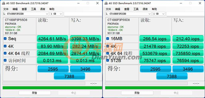 AS SSD Benchmark -- 顺序读写 4264 和 3398 MB/s 。