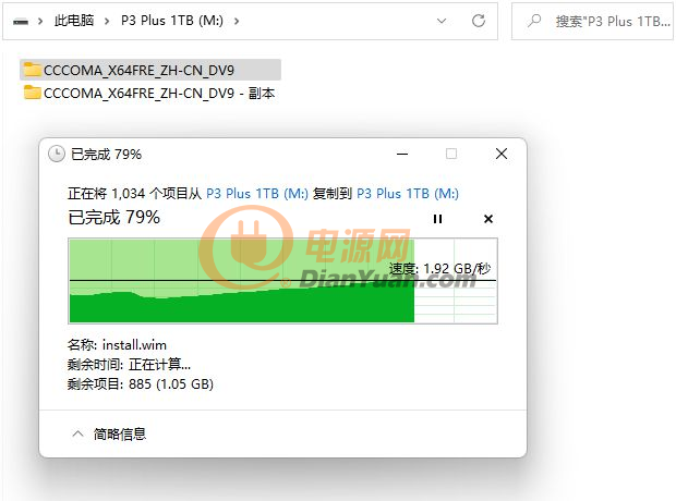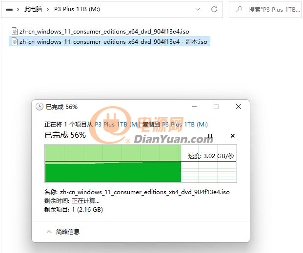 从读速 3100+ MB/s 的 512GB(PCIe 3.0 x4)副盘,向 P3 Plus 1TB 传输(写入)5.13 GB ISO 镜像 -- 速率可达 2.86 GB/s,主观感受可在 3s 左右完成操作。
