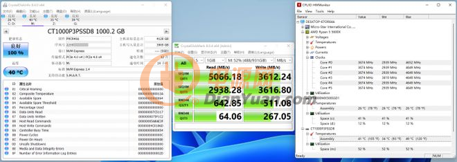 不过就算占用了一半左右的存储空间,英睿达 P3 Plus 1TB 的主控和固件方案,依然可确保在 Crystal Disk Mark 中达成官方宣称的 5000+ 和 3600+(MB/s)顺序读写速率,同时 HWMonitor 监测记录下的最高温度在 50℃ 左右。