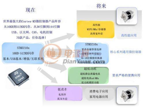 从功率开关分立器件,到复杂的系统芯片,意法半导体承诺以其独有的产品组合长期支持电机控制市场。STM32微控制器产品线将继续沿四个新方向部署,如图3所示,其中两个方向适用于电机控制。第一个产品线将面向低成本市场,开发低端的16位电机控制微控制器。另一个产品线以高性能为诉求,面向需要更高处理性能、更大存储容量和高带宽接口的应用。如此宽广的产品组合结合Cortex-M3内核,势必确立STM32架构适用于现在和未来电机驱动的多功能性。